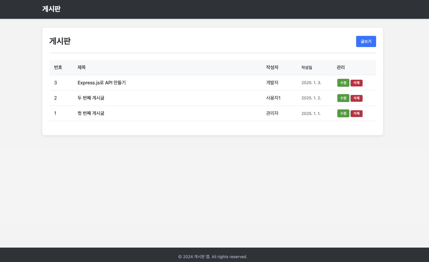 - 게시판 기능: 글 작성, 상세 조회, 목록 조회(페이지네이션), 수정, 삭제