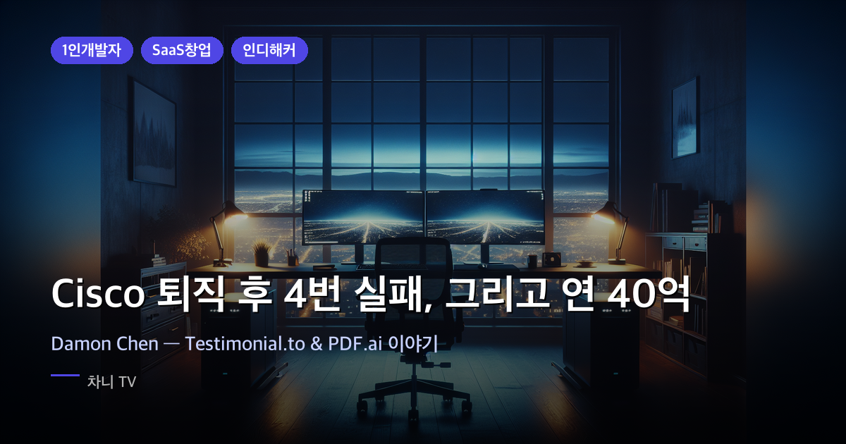 # 1인 개발자 # SaaS 창업 # 인디해커 # 퇴직 후 창업차니 TV 2026년 3월 15일 읽는 시간 약 10분실리콘밸리 Cisco에서 8년을 일한 개발자가 있었습니다. 연봉 $200,000. 안정적인 직장, 집, 가족.2020년 그는 아내에게 약속을 하나 합니다. "1년 안에 $100K ARR를 못 만들면 다시 취직할게." 아내가 혼자 모기지와 생활비를 책임지기로 했어요.그리고 네 번 실패했습니다. 가장 많이 번 프로젝트가 $1.99였어요. 그런데 다섯 번째 도전에서 Testimonial.to가 탄생했습니다. 이후 $20,000짜리 제품을 인수해 연 $1.5M ARR로 키웠고, 지금은 포트폴리오 합산 연 $3M 이상을 홀로 법니다. 그가 바로 Damon Chen입니다.Damon Chen은 누구인가..